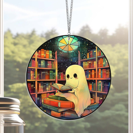 Halloween Ghost Reading Book Suncatcher - Cute Window Hanging for Book Lovers