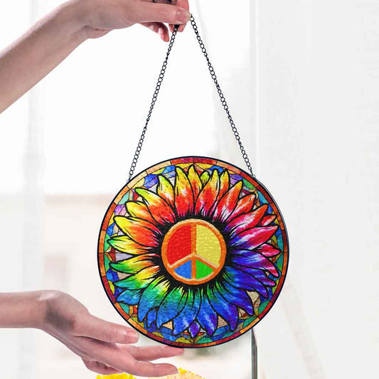 Hippie Stained Glass Suncatcher - Sunflower Peace Sign Acrylic Window Hanging