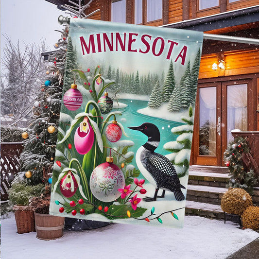 Minnesota Christmas Common Loon and Pink White Lady's Slipper Flag MLN4274F