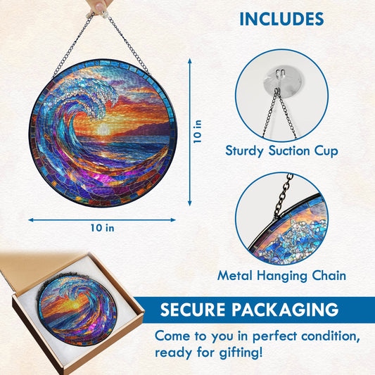 Ocean Wave Stained Glass Suncatcher - Beach Sunset Window Hanging for Coastal Home Decor