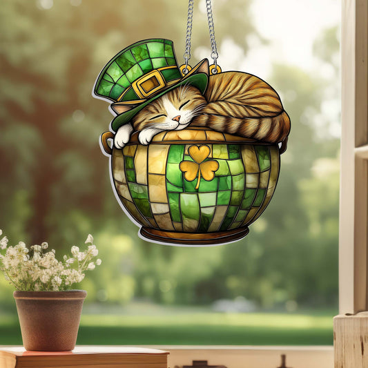 St. Patrick's Day Cat in Lucky Clover Pot Suncatcher Acrylic Hanging Sign MLN4770AS
