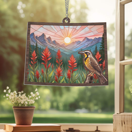 Wyoming Meadowlark Bird and Indian Paintbrush Flower 2 Layered Hanging Suncatcher TPT2163WHv2