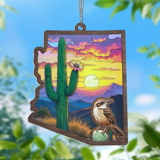 Arizona Cactus Wren and Saguaro Cactus Blossom 2 Layered Hanging Suncatcher TPT2163WHv3