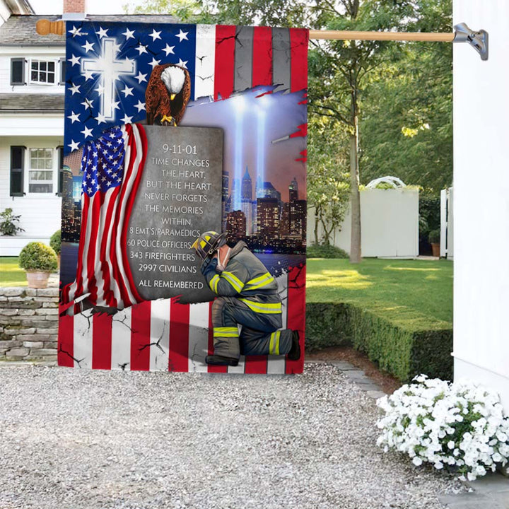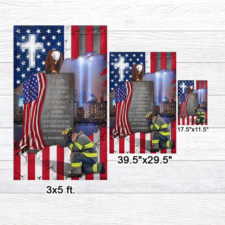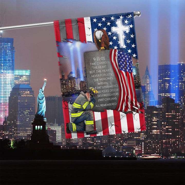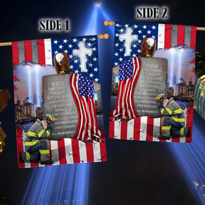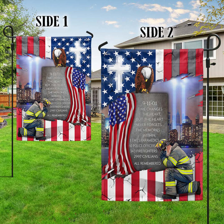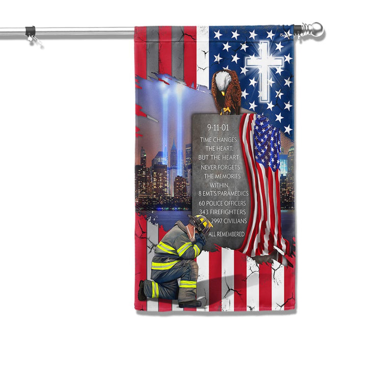 911 Patriot Day Never Forget Flag Time Changes The Heart But The Heart Never Forgets Flag MLN1726F